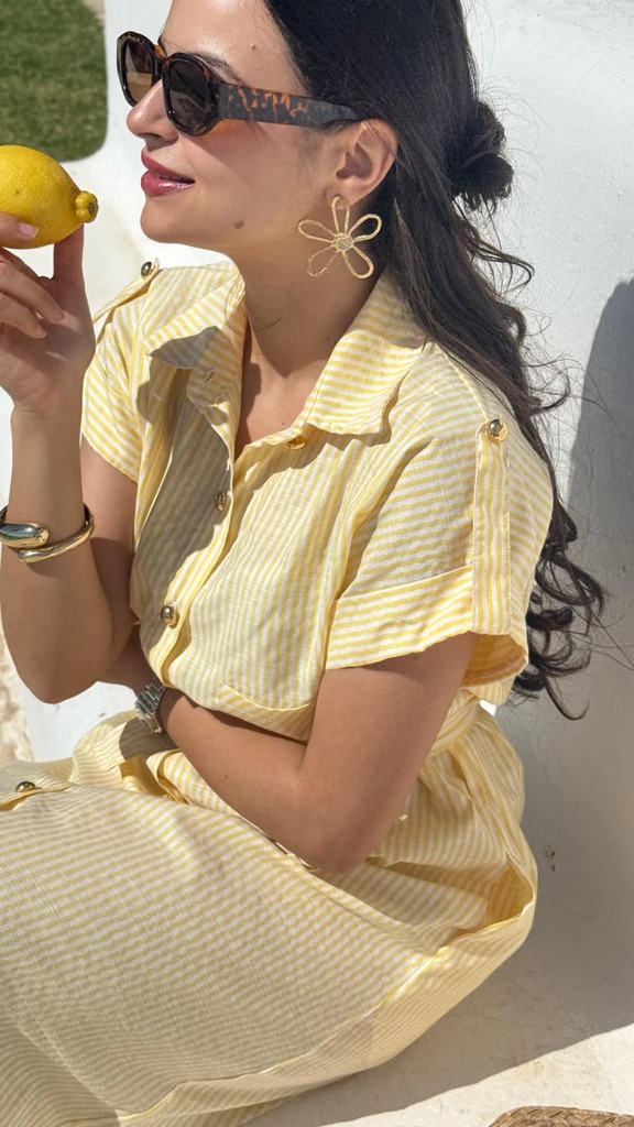 Robe rayé en lin , couleur jaune pastel avec des boutons en dorés.
