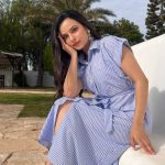Robe rayé en lin , couleur jaune pastel avec des boutons en dorés.