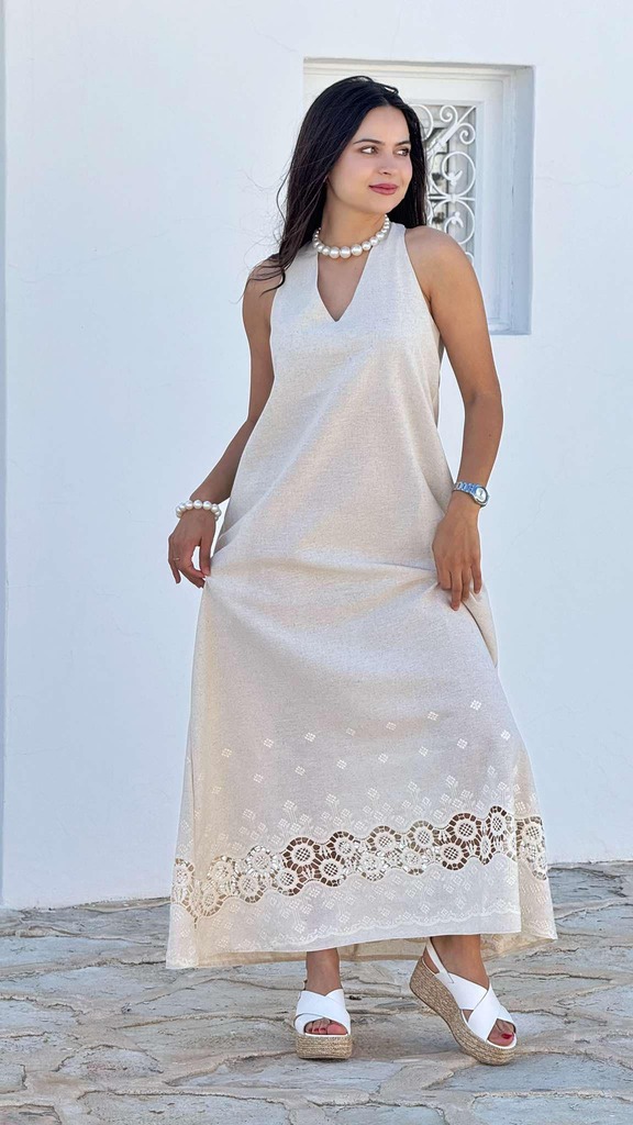 Robe longue fluide avec broderie, couleur beige claire (linen blend)