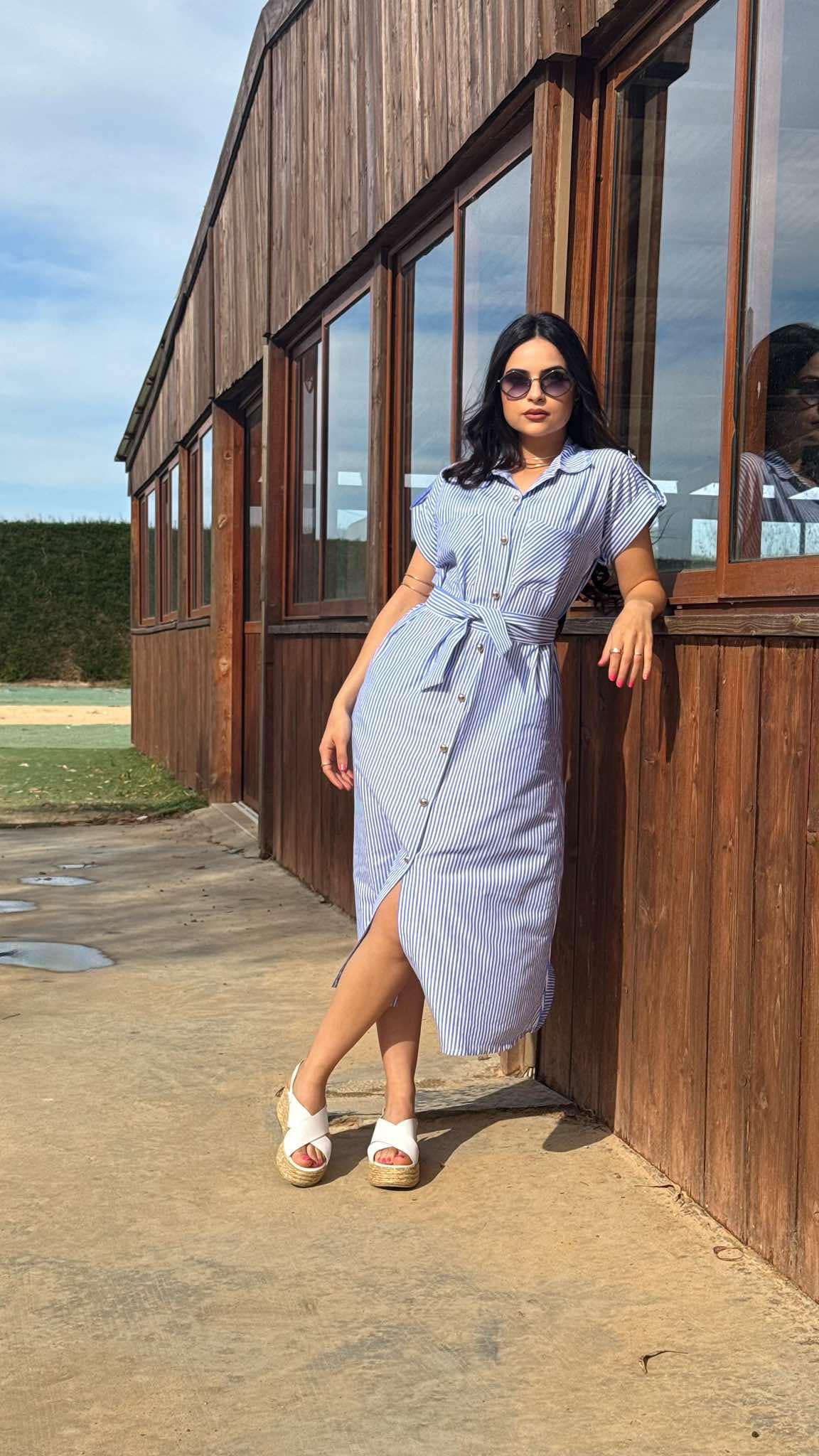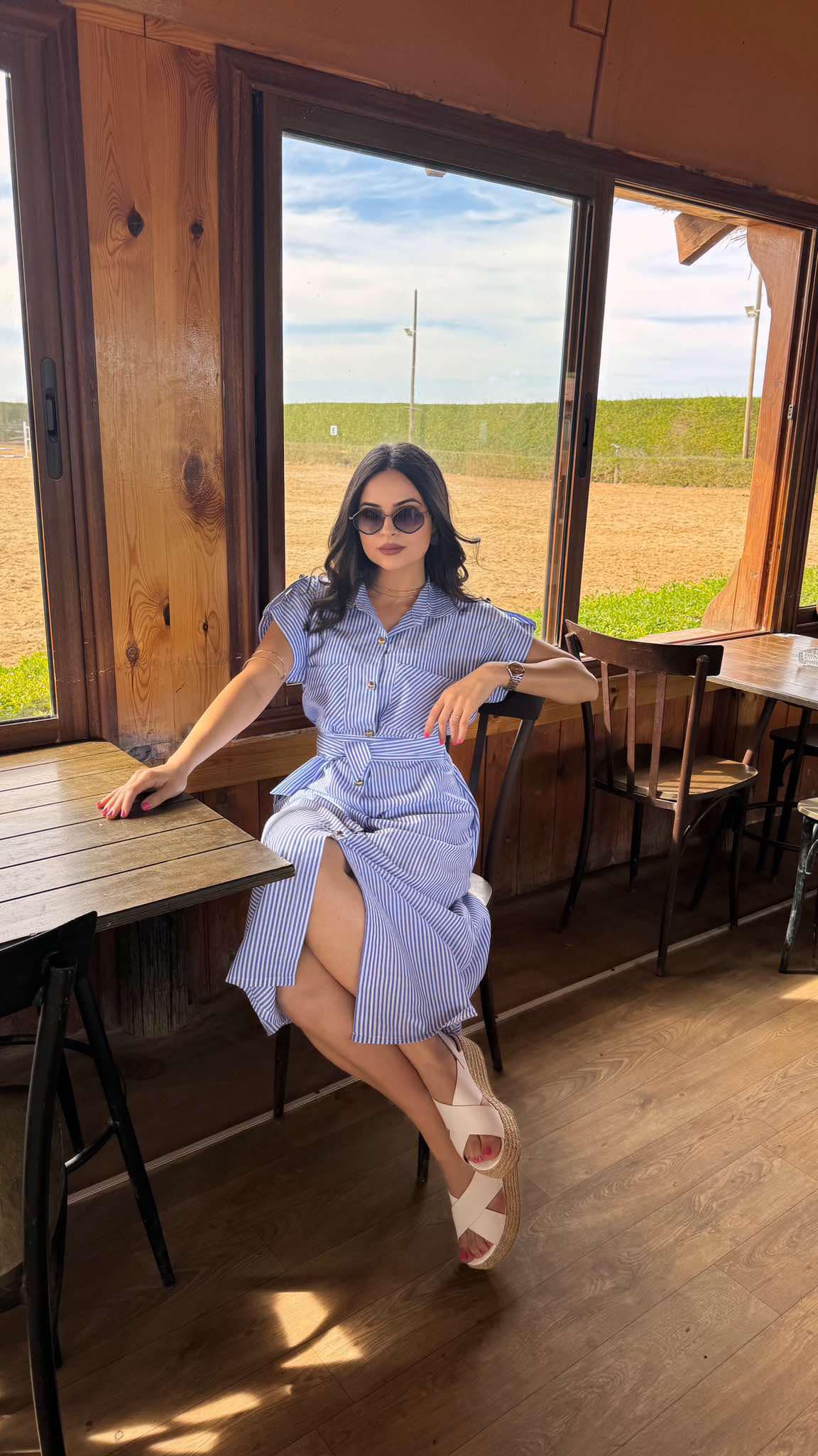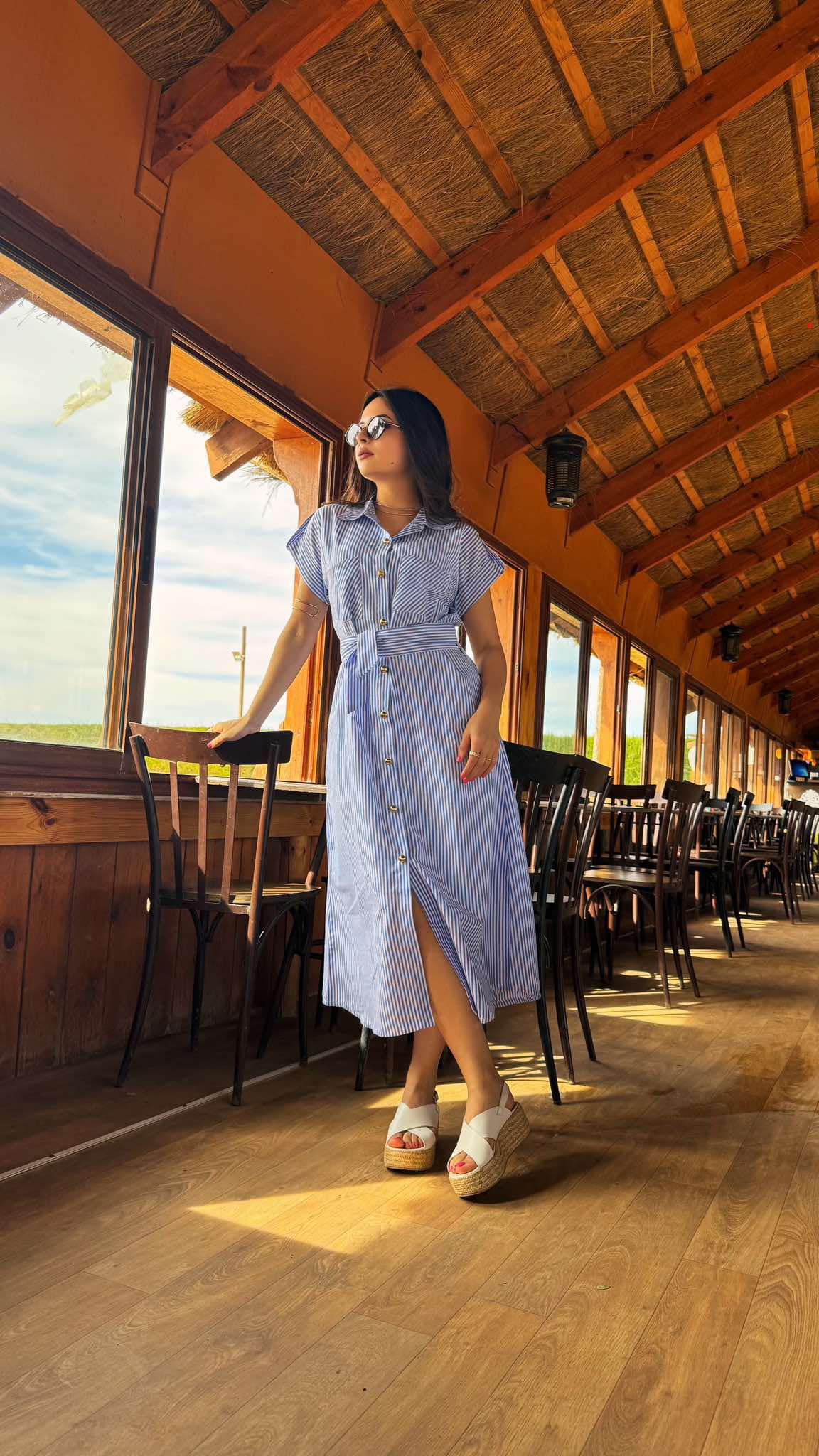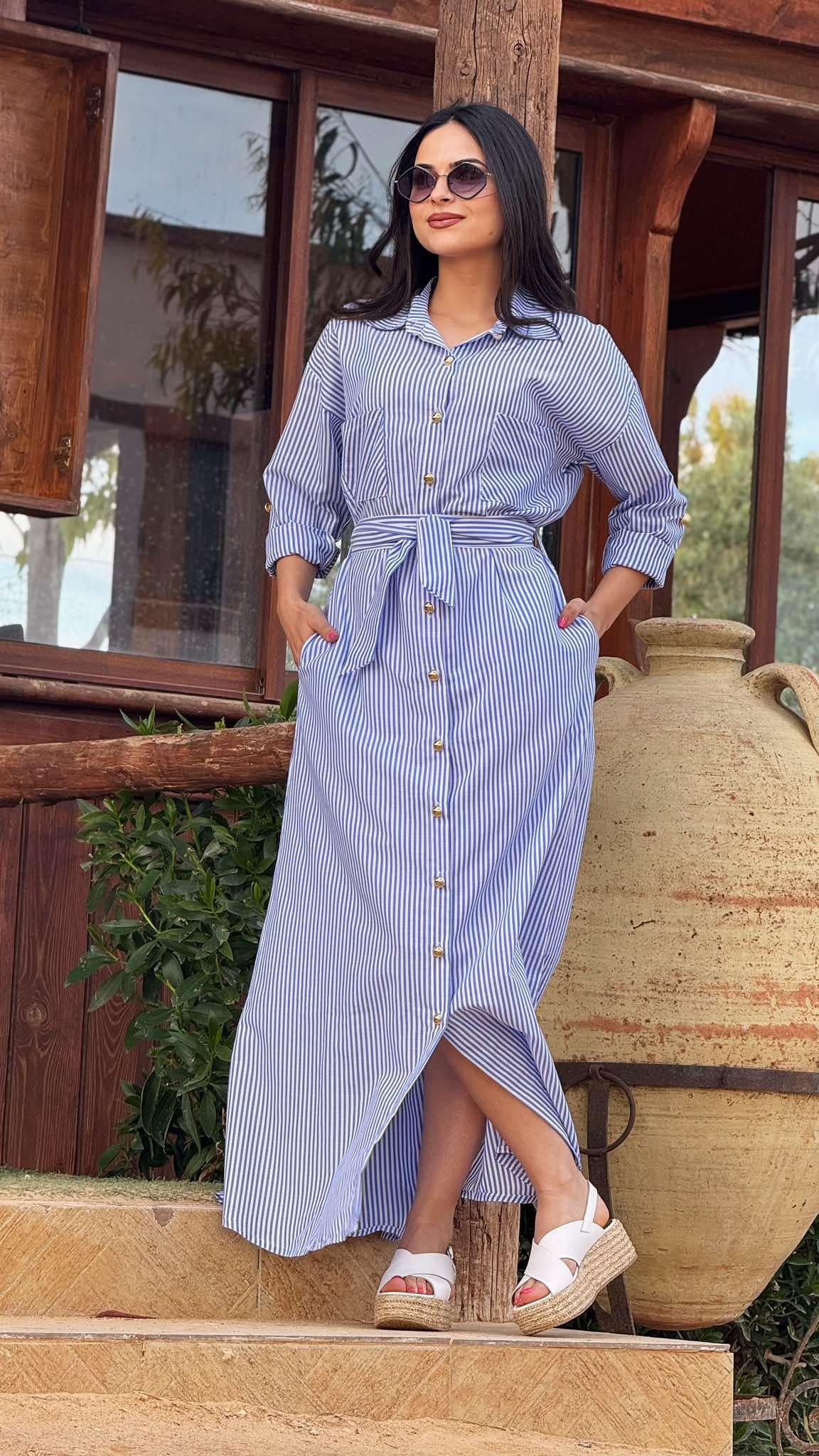 Robe en rayures longue (voilée ou non voilée) tissue en lin avec ceinture pour marquer la taille et des boutons en dorés.